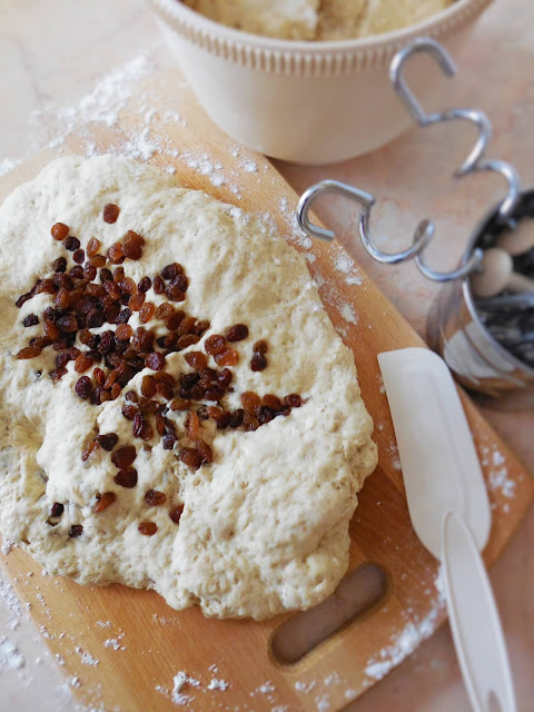 3. Krótko zmiksuj ciasto trzepaczkami na wolnych obrotach. Na końcu dodaj (namoczone wcześniej) rodzynki i wyrób ciasto ręcznie na stolnicy. Podziel go na 4 części, z każdej uformuj wałek o średnicy ok. 3 cm. (Jeśli ciasto się klei, posyp stolnicę i ręce odrobiną mąki).